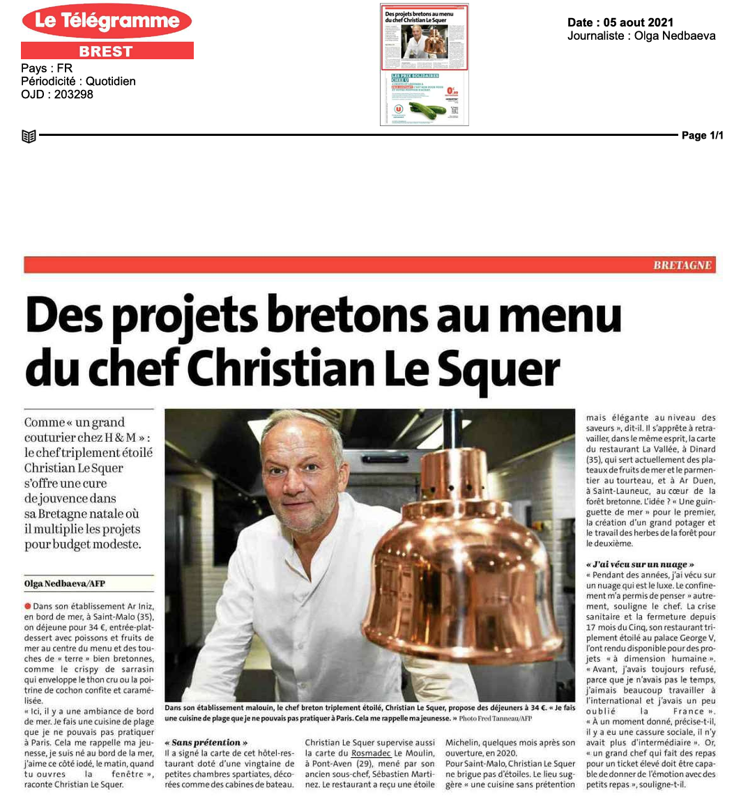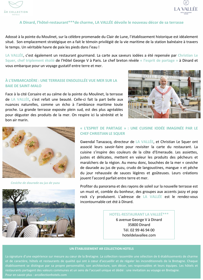 - Médiatisation des restaurants en Bretagne Ar Collection Hotels (restaurant étoilé Rosmadec Le Moulin* à Pont-Aven, AR INIZ à Saint-Malo et La Vallée à Dinard) et de l'actualité du Chef en France et à l'international.